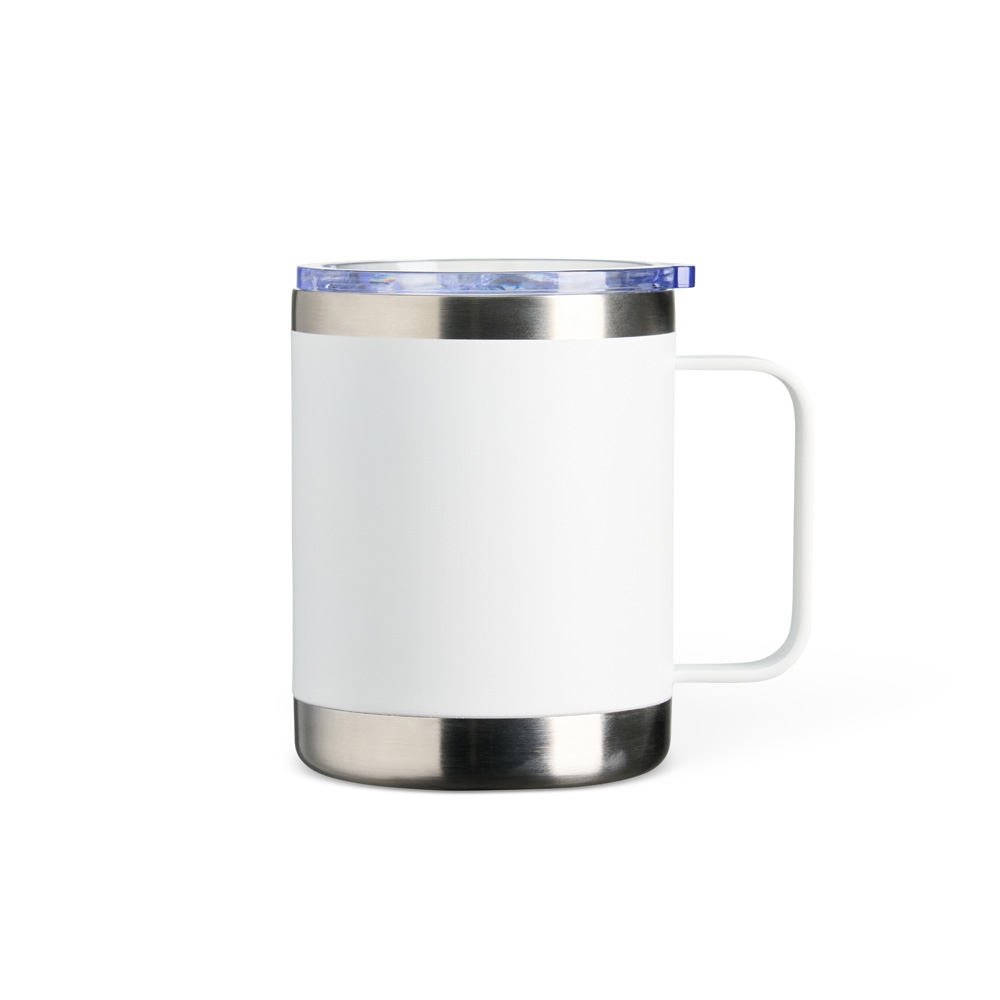 Caneca térmica de inox 390ml com parede dupla. Contém tampa acrílica com bocal e trava de segurança.