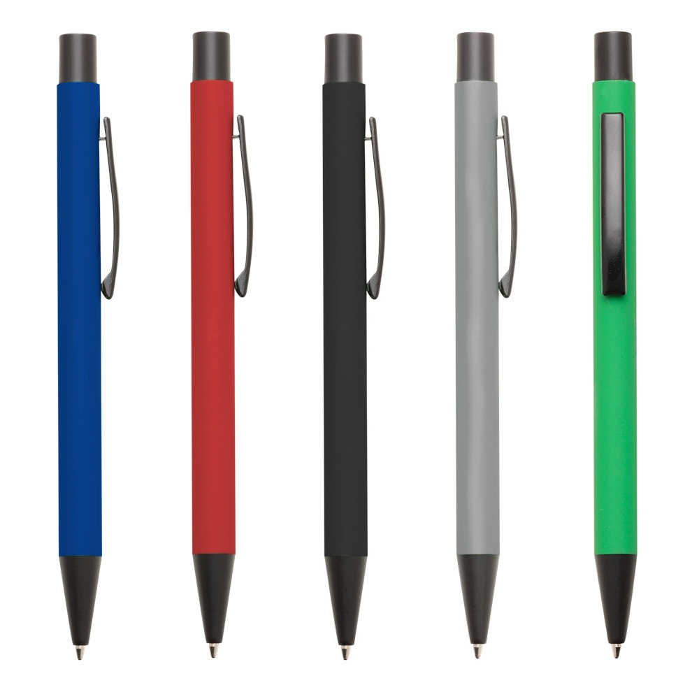 Caneta metálica com carga esferográfica azul e acionamento por clique.