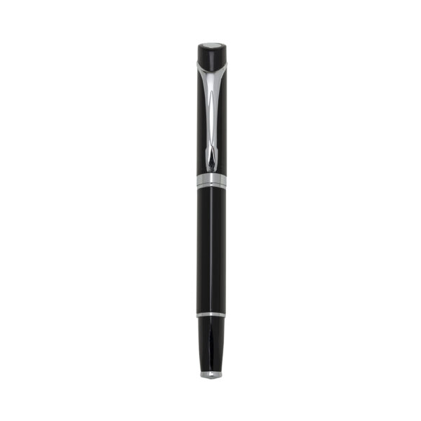 Caneta metálica triangular com tampa, carga esferográfica azul.