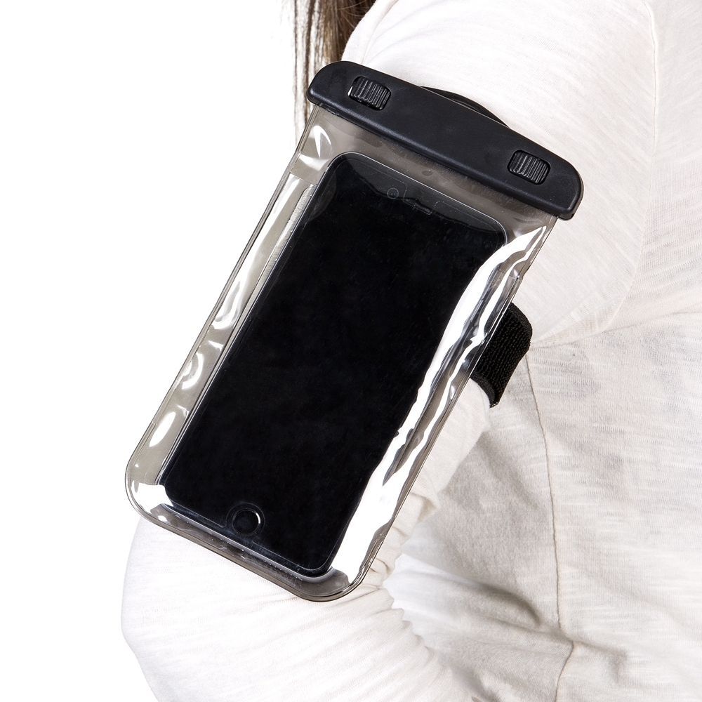 Case impermeável universal para smartphones com cordão de nylon de tamanho regulável.