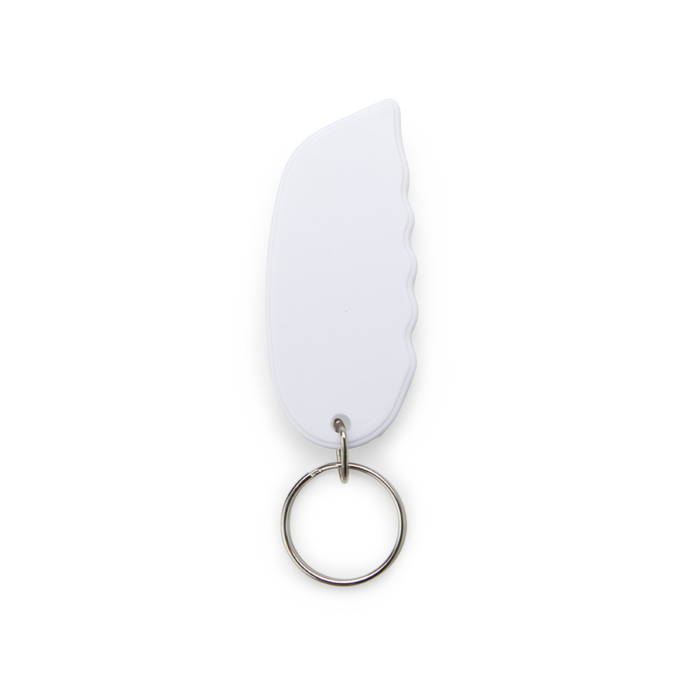 Chaveiro estilete. Sem trava, sendo necessário segurar o botão durante o uso.