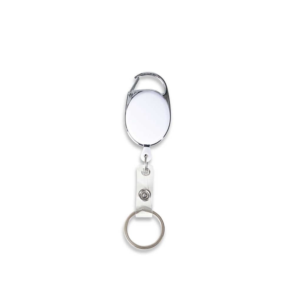 Chaveiro estilo mosquetão retrátil com porta crachá. Feito de metal e PVC. Acompanha argola em inox para chaveiro e suporte transparente para crachá com botão de pressão. Possui um clip atrás para pendurar.
