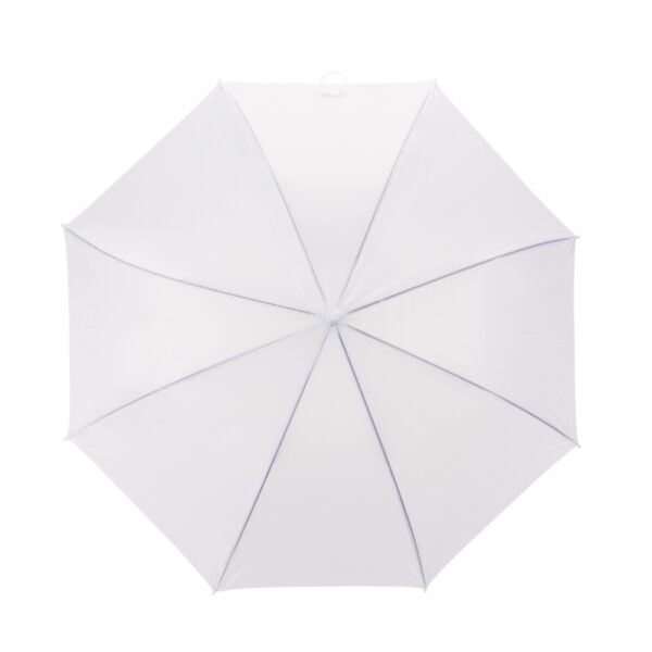 Guarda-chuva com tecido de nylon e abertura automática, basta acionar o botão inferior. Possui 8 varetas pretas de aço, pegador e bico superior de plástico.
