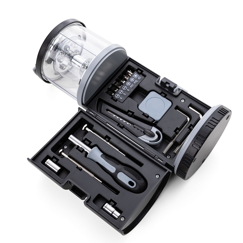Lanterna LED com Kit Ferramentas 15 peças, o kit contém: Mini chave de fenda, Mini chave philips, Cabo emborrachado para encaixe de ponta de chave de fenda e chave philips, 3 pontas de chave de fenda, 2 pontas de chave philips, 2 chaves hexagonais em L, 2 soquetes de chave hexagonal, Trena de 1 metro, Estilete e Extensor para soquete de chave hexagonal.