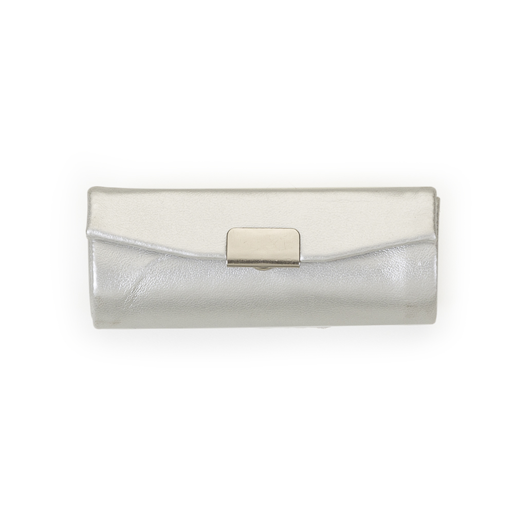 Porta batom em couro sintético prata com plaquinha de metal frontal com botão para abrir/fechar, possui um espelho interno.