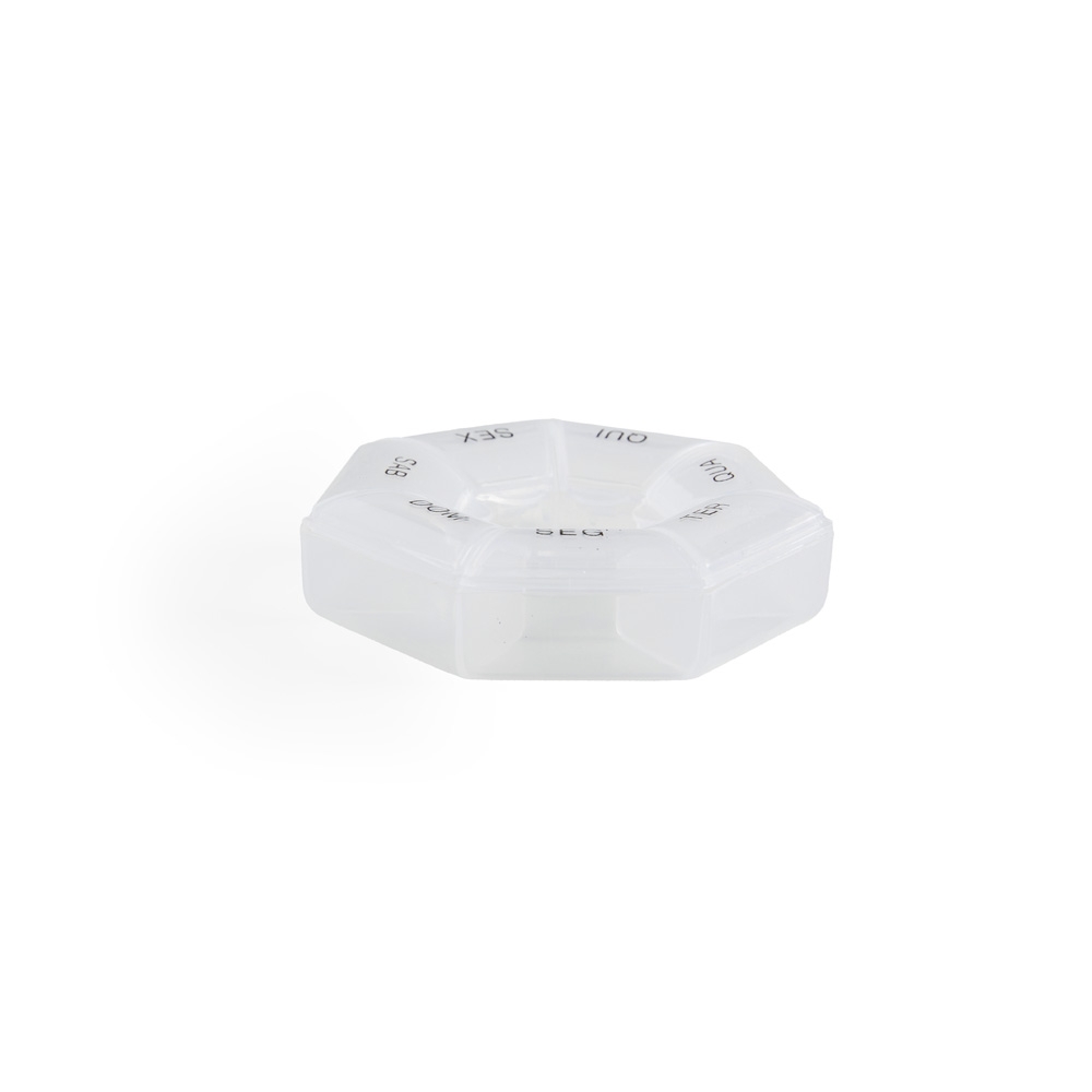Porta comprimidos semanal, feito em plástico.